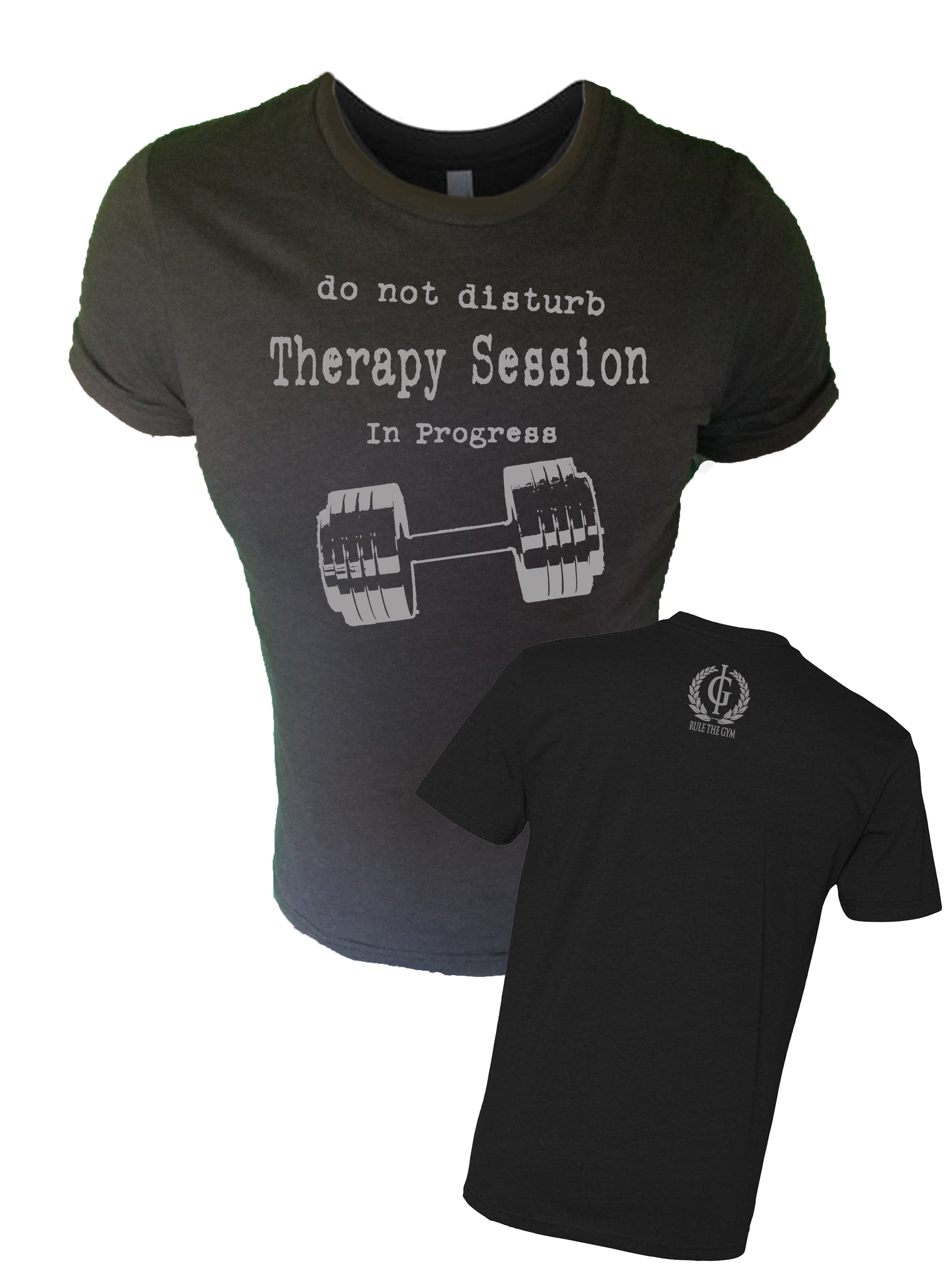 The Therapy Session Workout Shirt Is Made From A Super Comfortable 60/40 Poly/Cotton Blend. This T-Shirt Is Screen Printed In-House And Comes In Black And Heather Navy Blue With The Logo On The Front & Iron Gods Crest On Back. Superior Quality Men's Gym Clothing.