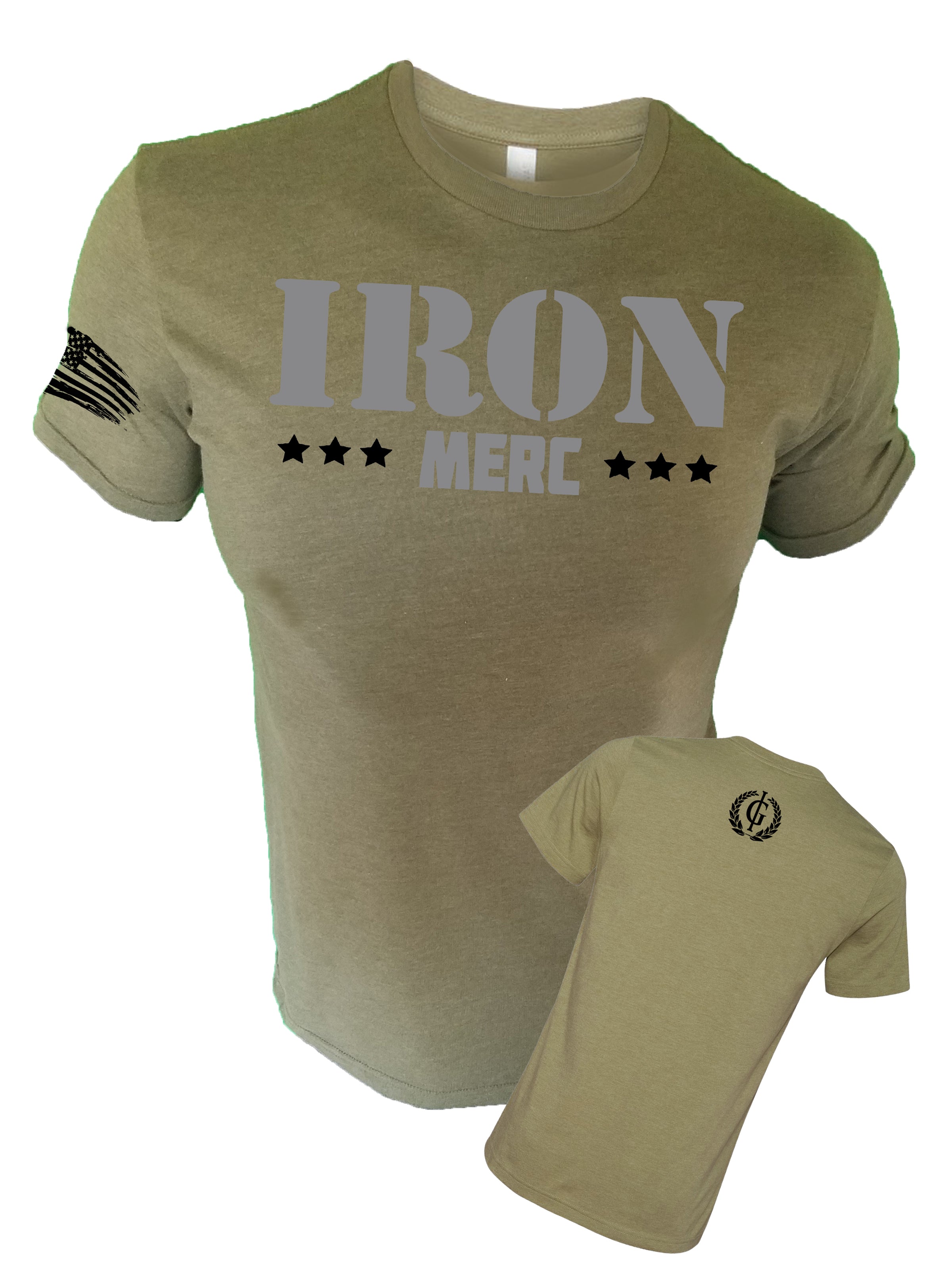 Our Iron Merc T-Shirts Are A Poly/Cotton Blend. Breathable & Comfy But Still Durable And Ready To Handle Whatever Workout You Throw At It. This T-Shirt Is Screen Printed In-House And Comes In Army Or Military Brown With The Design On Front, American Flag On The Sleeve And IG Crest On Back. Superior Quality Gym Clothing.