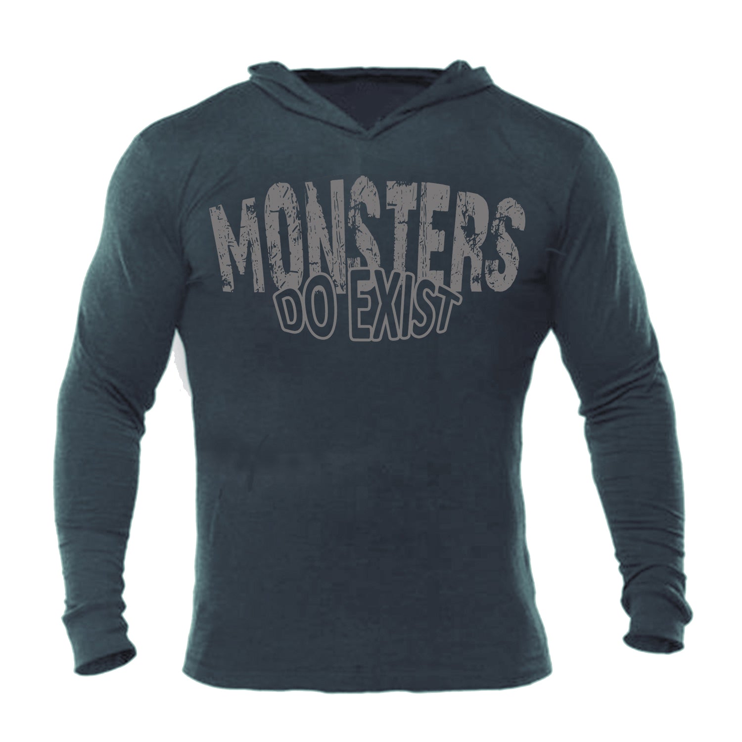 A lightweight, hardcore workout hoodie/ (pump cover) with the bold “Monsters Do Exist” front graphic and the Iron Gods crest on the back—built to stand out and perform under fluorescent lights, set after heavy set.